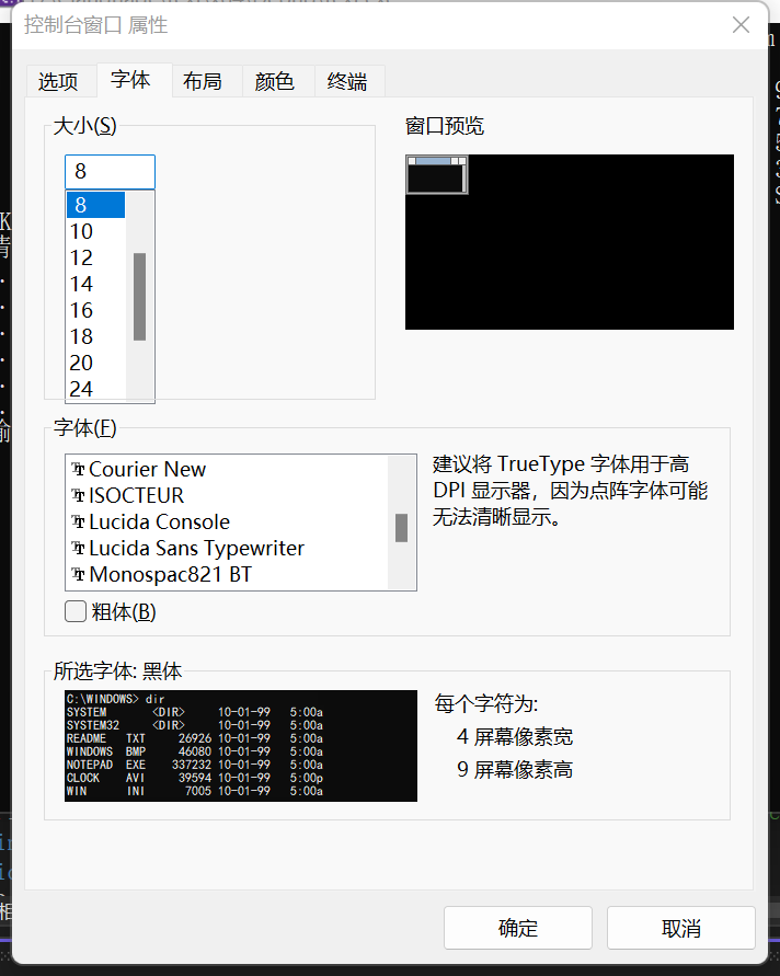 字体(F)中找到点阵字体,选择并点击确定。 - 关闭当前控制台,重复1步骤。